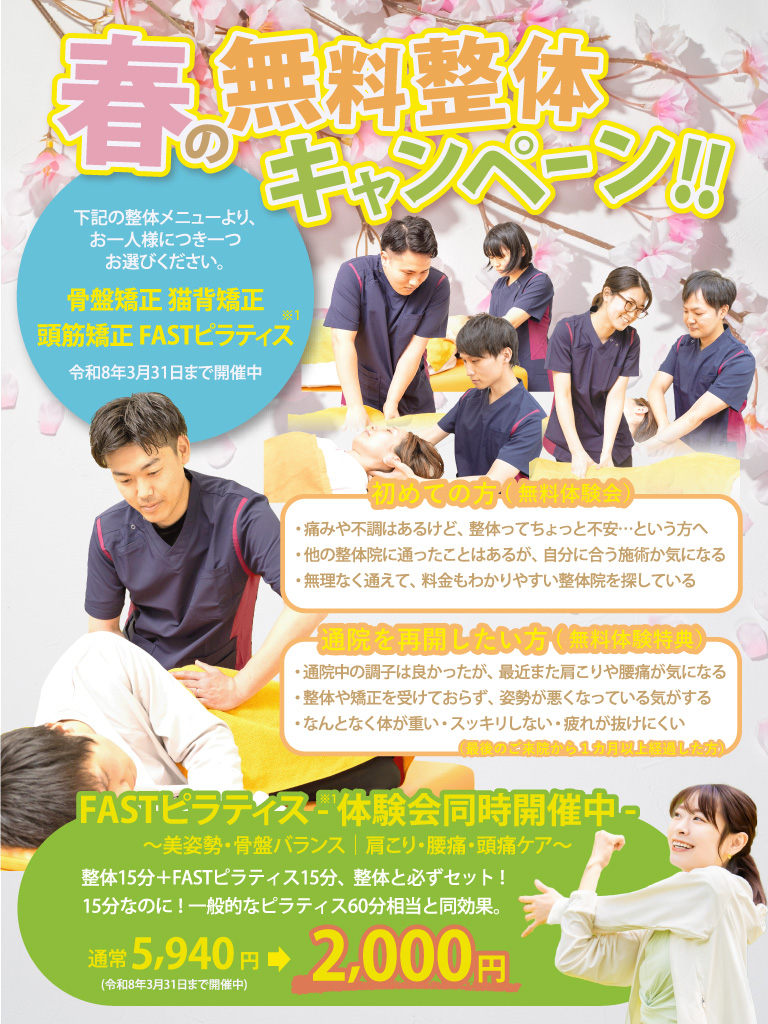 お電話での予約時、またはご来院の際には「無料整体キャンペーン」とお伝えください。